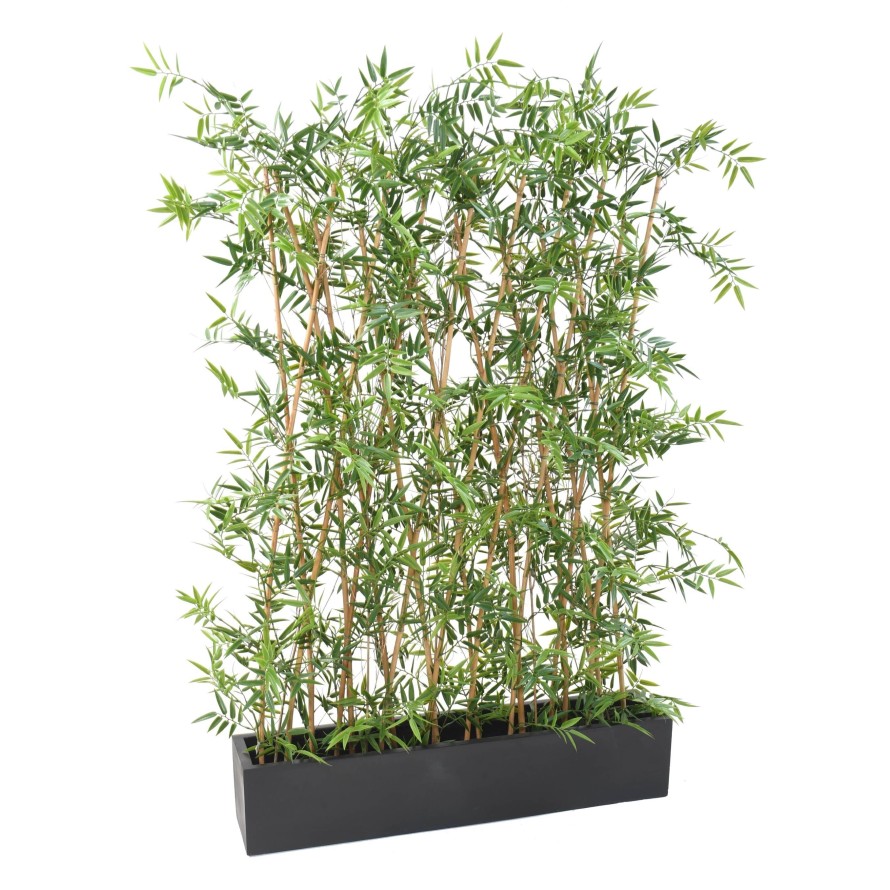 BAMBOU JAPANESE HAIE EN JARDINIÈRE Artificiel, la haie de Bambou Japanese (réf.10545-UV71) est assemblée dans une balconnière fiber noire 100x20x20 (réf. FINE1002020N). Cet ensemble peut être réalisable avec un bac différent suivant notre gamme et un surfaçage de votre choix tel que la mousse, les écorces, les billes dargile, les cailloux multicolores ou blancs. Cette composition est fabriquée dans nos ateliers en France sur commande.