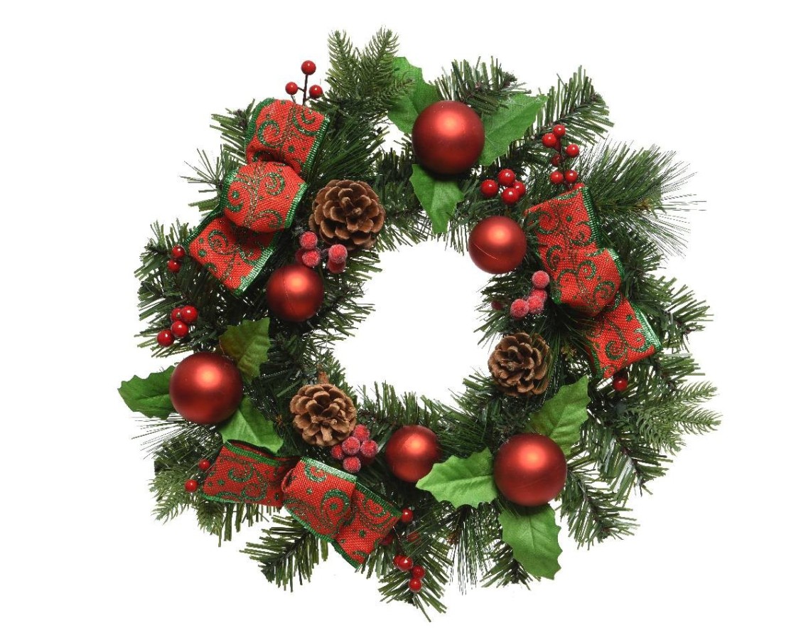 COURONNE BOULES ROUGES - RUBANS - POMMES PIN