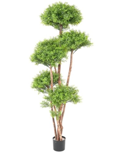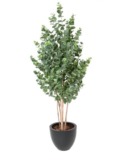 EUKALYPTUS 81 M TREE 160cm, Künstlich, bestehend aus 6 PE-Kronen und einem natürlichen Multistamm, Blatthöhe 50cm, Spannweite 70cm, an der Basis ein PVC-Topf mit einem Durchmesser von 16cm und einer Höhe von 14,5cm. Geeignet für den Außenbereich, aber der Holzstamm muss mit einem wasserabweisenden Mittel behandelt werden. Der Originaltopf muss ein Loch haben, damit das Wasser ablaufen kann. Er sollte im Dekotopf befestigt werden, wobei eine Drainage vorgesehen werden muss, damit sich kein Wasser am Fuß der Pflanze staut.