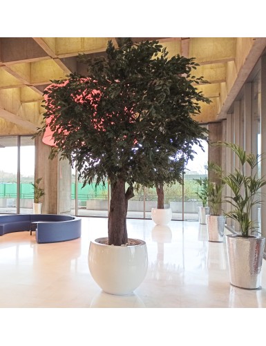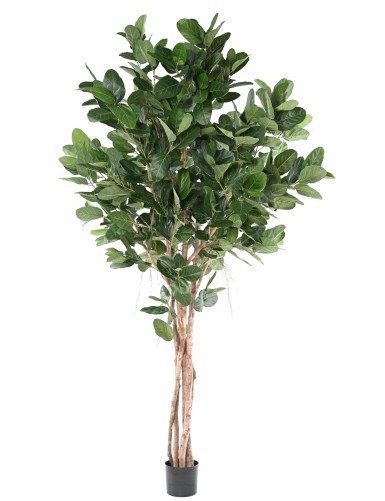 FIKUS LIANES UMBRELLA Künstliche Pflanze, bestehend aus 25600 Blättern und 12 Zweigen zum Zusammenstecken. Die 12 Zweige sind 220cm lang und 120cm breit. Die lichte Höhe beträgt 230cm. Die Höhe des Stammes beträgt 280cm. An der Basis befindet sich ein quadratischer Holztopf von 25x33cm. Das entsprechende Laub ist FIKUS FAT ZWEIG*48 (Ref. 5480-71).