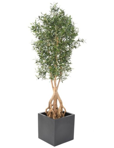 OLIVENBAUM KRONE GROSS Künstlich, bestehend aus 6552 Blättern, 108 Früchten und einem Stamm mit einem Durchmesser von 7cm, an dem 6 Äste an den Seiten angebracht werden können. Lichte Höhe von 60cm (einschließlich Topf). An der Basis befindet sich ein PVC-Topf mit einem Durchmesser von 19cm und einer Höhe von 18cm.