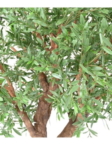 OLIVENBAUM NC Künstlich, bestehend aus einem Stamm aus Glasfaser mit einem Durchmesser von 40cm, die Äste aus Holz haben einen Durchmesser von 6 bis 8cm, die lichte Höhe beträgt 180cm, mit einer Spannweite von 300cm, an der Basis eine 52×52cm große Platte. Der Hauptstamm ist aus Glasfaser und die Verzweigungen sind aus Holz.