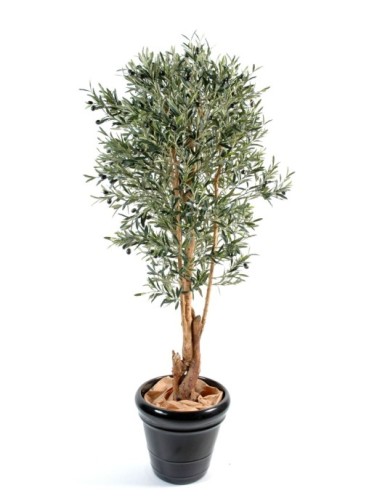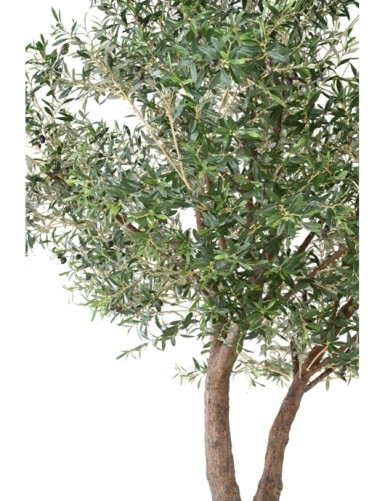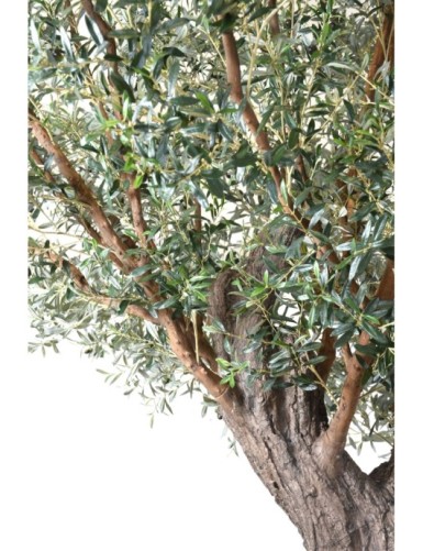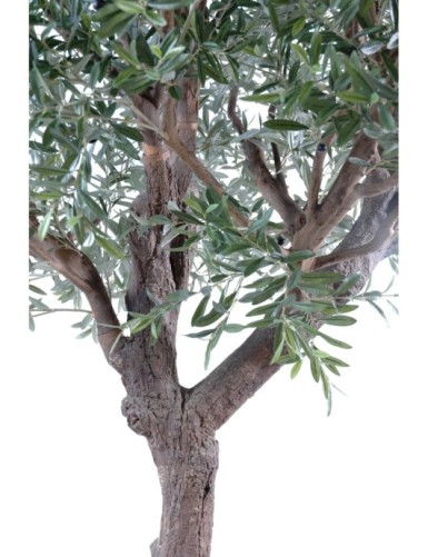 OLIVENBAUM L 370 Künstlich, mit Oliven, die 17306 Blätter umfassen. Er hat eine lichte Höhe von 180cm und einen Hauptstamm aus Glasfaser mit einem Durchmesser von 17cm und 22cm kurz vor der Trennung in verschiedene STÄMME . Bestehend aus 4 großen und 3 kleinen Zweigen aus Naturholz, die ineinander gesteckt werden können. An der Basis eine 45x45cm große Platte.