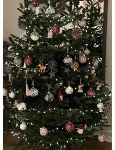 GLÄNZENDE SCHAUMSTOFFKUGELN TANNE (Weihnachtsbaum) GRÜN/WEISS (24er-Packung), bestehend aus 12 grünen und 12 weißen Kugeln, mit einer silberfarbenen Klammer und einem Juteband zum Aufhängen.