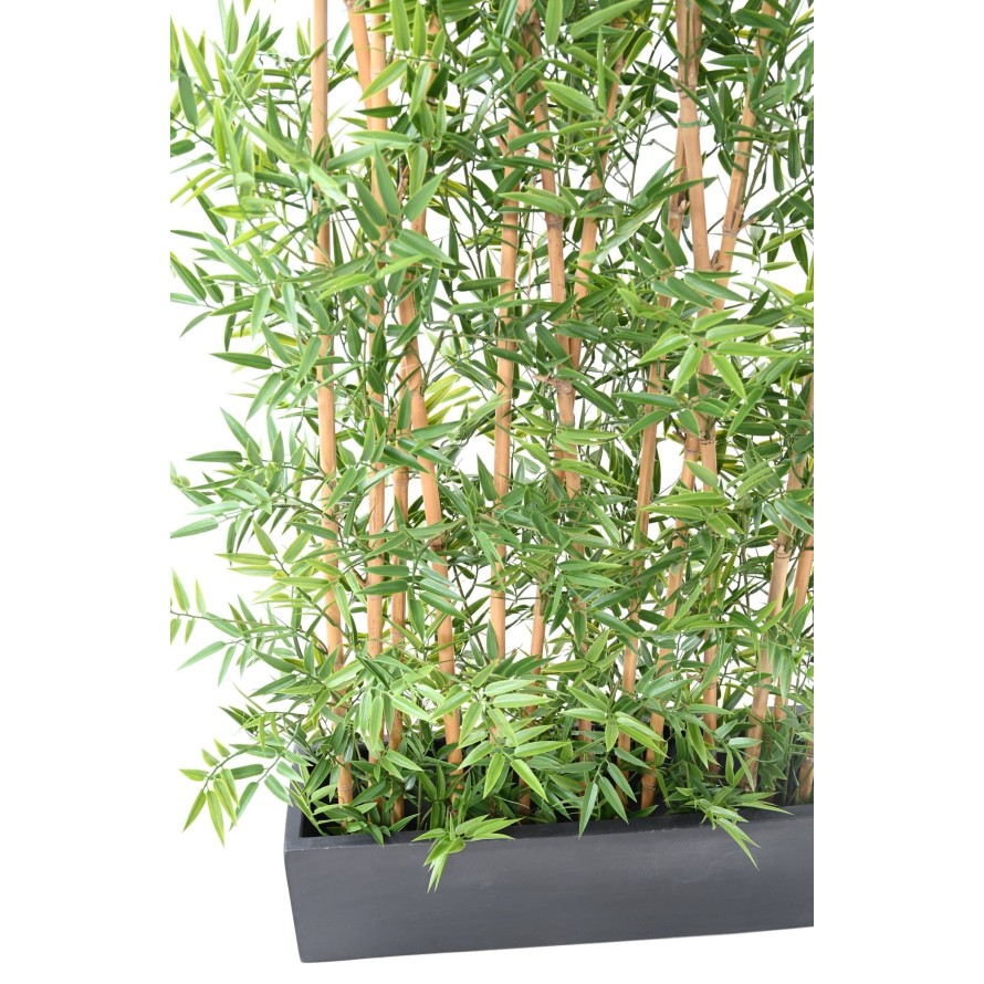 Artificial JAPANESE BAMBOO PLAST DENSE HEDGE UV BASE 70, consisting of 14 bamboo canes with a wooden base 70 cm x 18 cm. Suitable for outdoor use. UV resistance guarantee: 2000 hours (hours of sunlight), i.e. approximately 2 years. Drain water from the decorative tray to protect the base and canes from damp. Outside, remember to seal the base and the bottom of the canes in your planter to prevent them being blown away by the wind.