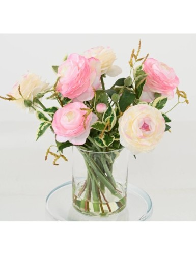 This bouquet of pink and white ranunculus (buttercups) has been made in our factories in Asia. It has 7 flowers measuring 9 cm in diameter and 15 buds. The glass vase is 16 cm high and 13 cm in diameter.