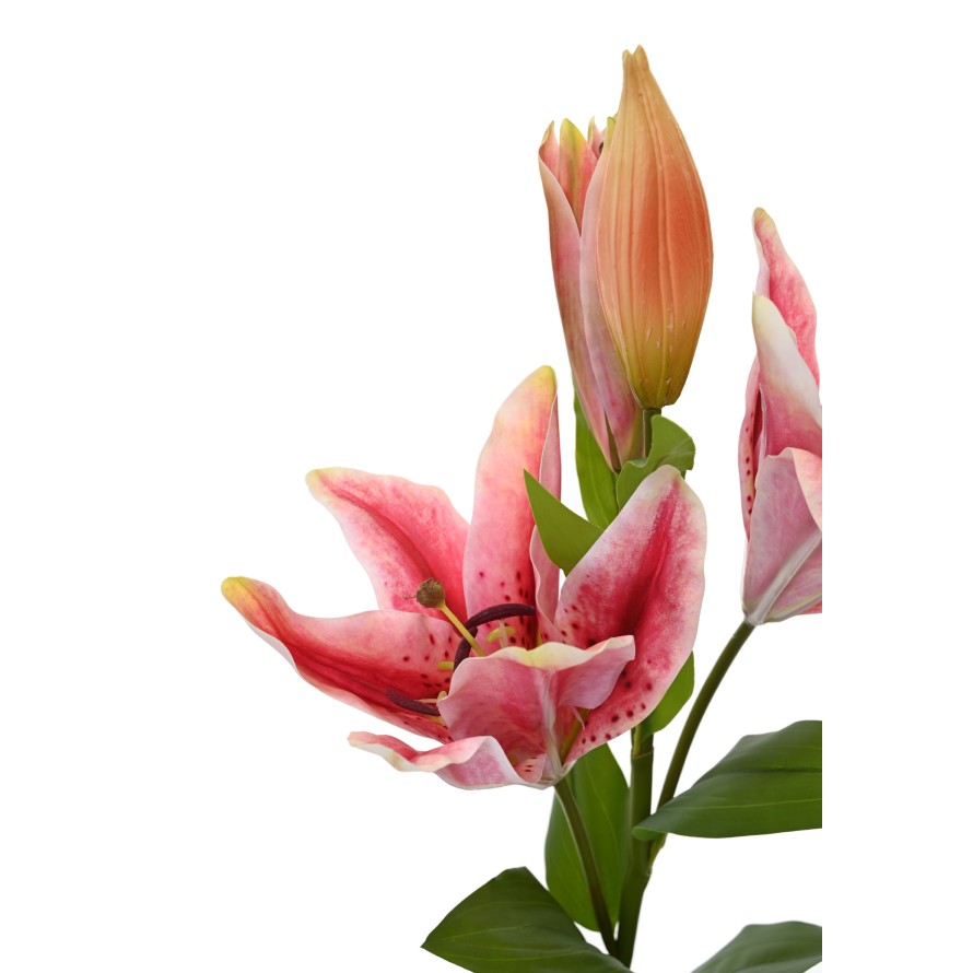 Artificial LILY CASABLANCA 2fl, consisting of 2 flowers 15 cm in diameter and 2 buds with a 35 cm reinforced stem. The flowers and foliage are made from PEVA: polyethylene vinyl acetate, a 100% recyclable material.
