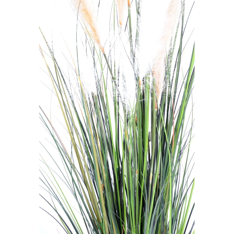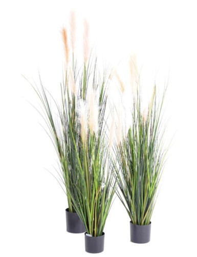 Artificial CAREX LL, artificial grass plant with 9 white and beige polyester flowers, with a PVC pot at the base of diameter 17 cm and height 15 cm.