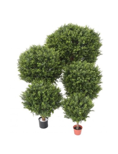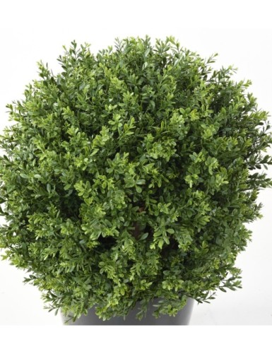 Artificial BOXWOOD BALL RED DAY UV, diameter 50 cm, wooden trunk, height of trunk between bottom of ball and before pot: 12 cm, height between bottom of ball and pot (ground): 23 cm. The wood used for the trunk is Theaceae. The base is a PVC pot 9 cm high and 11 cm in diameter. The original pot must be pierced to allow water to drain out. It should be attached to the decorative planter, creating drainage to prevent water stagnating at the foot of the plant. Suitable for outdoor use. UV resistance guarantee: 2000 hours (hours of sunlight), i.e. approximately 2 years.