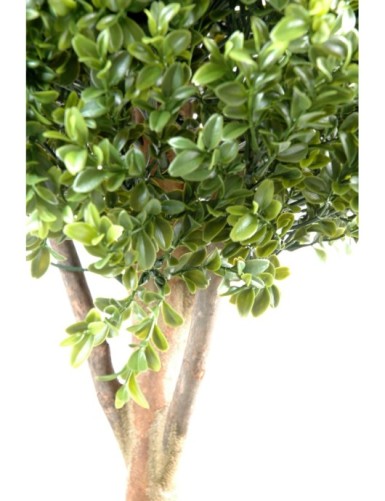 Artificial BOXWOOD STEM DOUBLE BALL, the top ball has a diameter of 35 cm and the bottom ball has a diameter of 40 cm. The wood used for the trunk is Theaceae. The base is a pot with a diameter of 16.5 cm and a height of 15 cm. Suitable for outdoor use, but the wooden trunk must be treated with a water-repellent product. The original pot must be pierced to allow water to drain out. It should be attached to the decorative planter, creating drainage to prevent water stagnating at the foot of the plant.