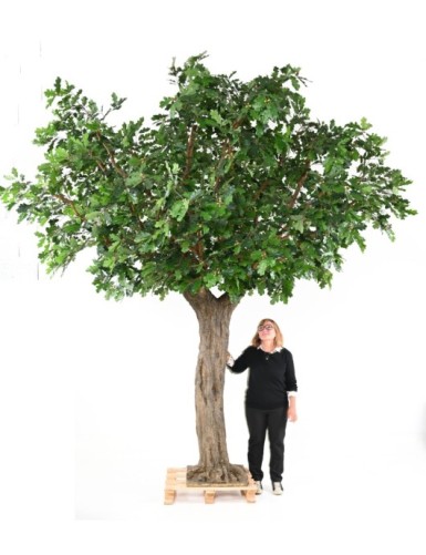 Roble t 360 artificial, consta de 6540 hojas, un tronco principal de 18 cm de diámetro y 3 troncos secundarios de 6 a 8 cm de diámetro. La altura del tronco solo es de 178 cm, altura bajo follaje de 140 cm, con una envergadura de 280 cm, base con pletina de 45 x 45 cm. hay 5 ramas principales y 2 ramas secundarias para ensamblar. El tronco principal es de fibra de vidrio y las ramas son de madera. tarda 2,5 horas en montarse.