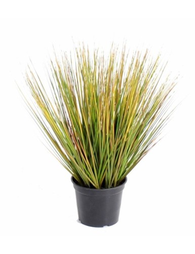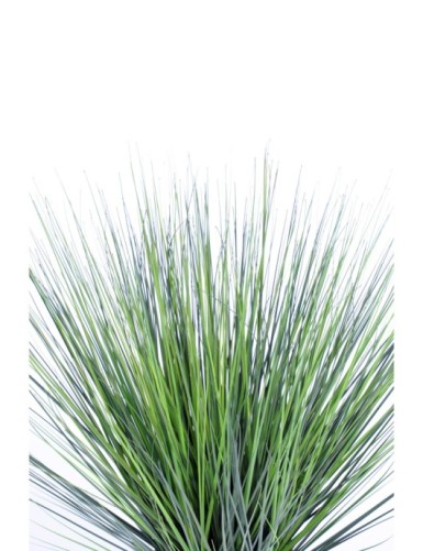 Hierba de cebolla presle (cola de caballo), con follaje de PE y base con maceta de PVC de 13 cm de altura y 14,5 cm de diámetro.