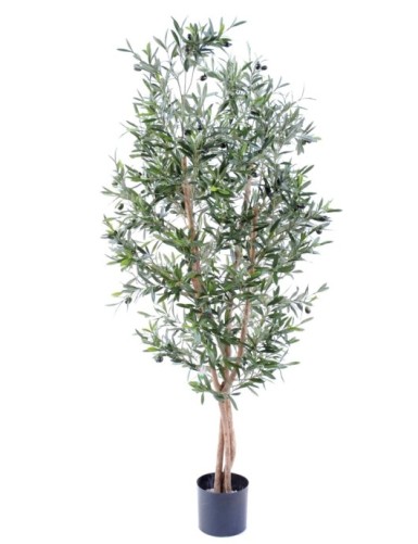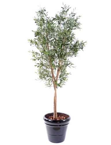Olivo cabeza gigante plást. 270 resistente a los rayos UV artificial, con aceitunas de plástico, consta de 9 ramas de madera natural para fijar en el tronco de fibra de vidrio. La altura bajo el follaje es de aproximadamente 150 cm. tronco de 185 cm de alto con un diámetro entre 14 y 18 cm. en la base, un cuadrado de madera de 25,5 cm de lado y 20,5 cm de alto. Apto para exterior, pero protegido del viento. Es necesario perforar la maceta original para permitir que el agua drene. Se debe fijar a la maceta decorativa creando un drenaje para evitar cualquier estancamiento de agua al pie de la planta. garantía de resistencia a los rayos UV: 2000 horas (horas de luz solar) o aproximadamente 2 años.