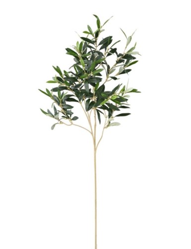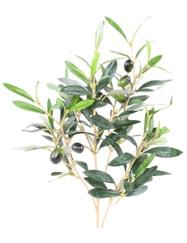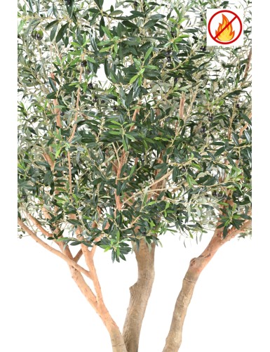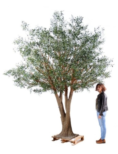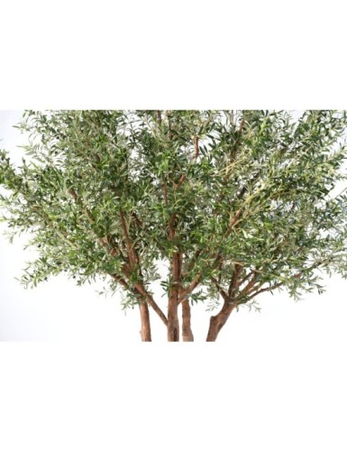 Olivo árbol l 370 artificial, con aceitunas y 17 306 hojas. tiene una altura bajo follaje de 180 cm y un tronco principal de fibra de vidrio con un diámetro de 17 cm y 22 cm justo antes de la separación en diferentes troncos. Consta de 4 ramas grandes y 3 ramas pequeñas de madera natural para encajar. Base con pletina de 45 x 45 cm.