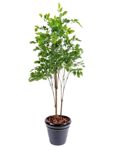 Cafeto flores troncos nudosos artificial, con tronco nudoso (di ámetro 10 cm) fabricado en madera y follaje de tergal, frutos de PVC rojo y verde y flores blancas de tergal. Base con maceta de 18 cm de di ámetro y 15 cm de altura.