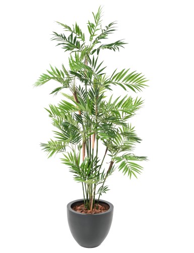Palmera rhapis excelsa artificial, consta de 7 palmas. Base con maceta de PVC de 16 cm de diámetro y 15 cm de altura.