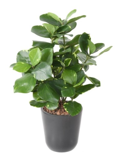 Alocasia cucullata artificial, incluye 20 hojas de diferentes tama ños y 2 troncos de 3 cm de di ámetro. Base con maceta de PVC de 10 cm de altura y 11 cm de di ámetro.