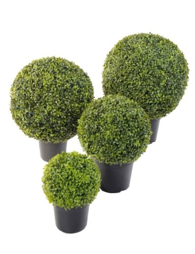 Boj esfera new artificial, con una altura bajo follaje (tronco + maceta) de 31 cm. La especie utilizada para el tronco es theaceae. Apto para uso exterior, pero el tronco de madera debe tratarse con un producto hidrófugo. Es necesario perforar la maceta original para permitir que el agua drene. Se debe fijar a la maceta decorativa creando un drenaje para evitar cualquier estancamiento de agua al pie de la planta.