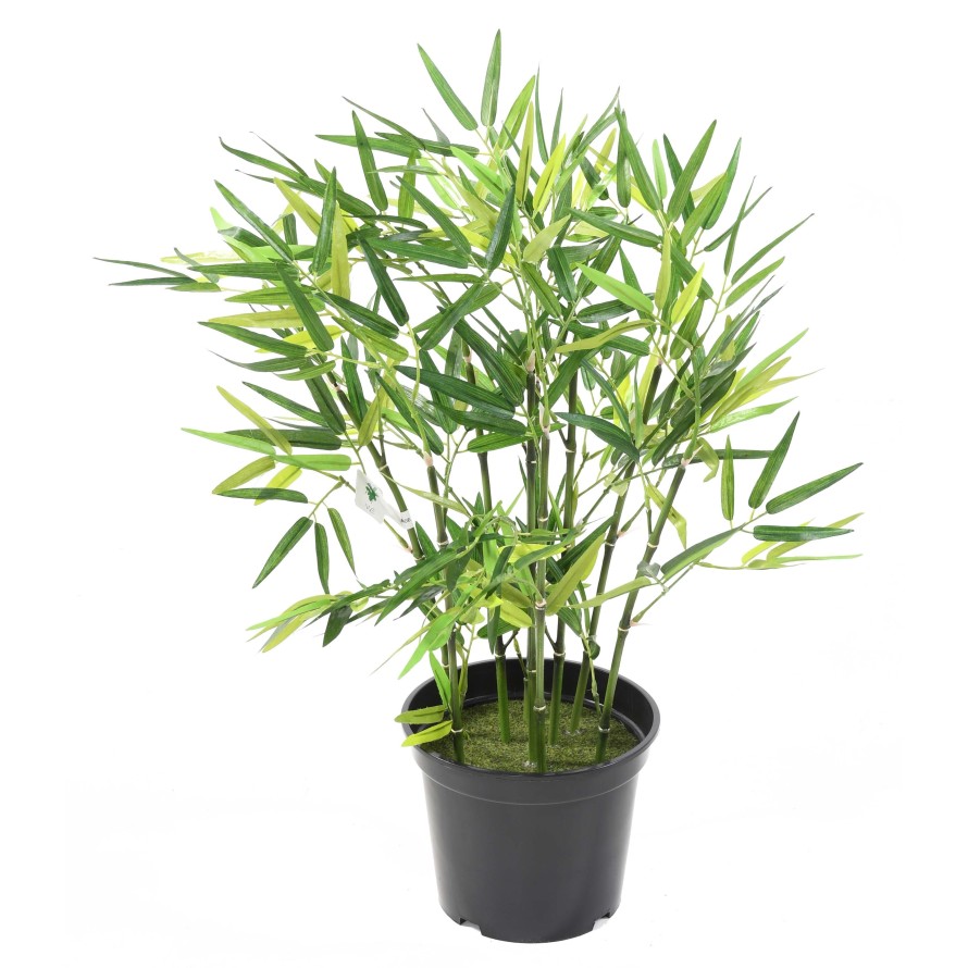 BAMBOU TV, arbre artificiel de 60 cm de hauteur avec 9 tiges vertes. Le pot de base est en PVC avec un diamètre de 17 cm et une hauteur de 14 cm.