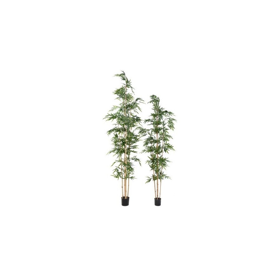 BAMBOU ASSYMETRIQUE Artificiel, composé de 4 cannes naturelles entre 3 et 4 cm de diamètre et de1408 feuilles, feuillage en tergal, à la base un pot PVC de diamètre 20cm et hauteur 18cm.