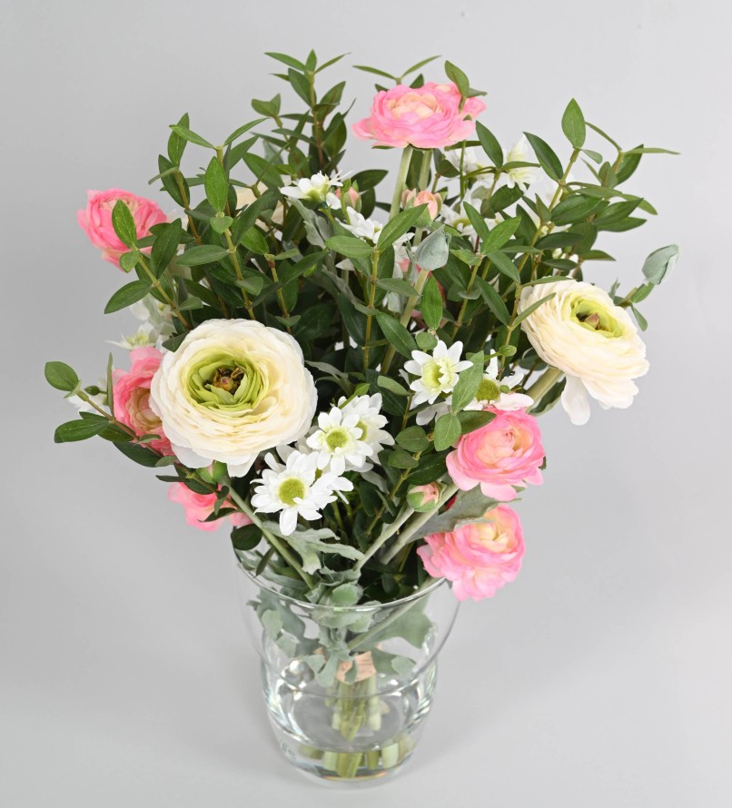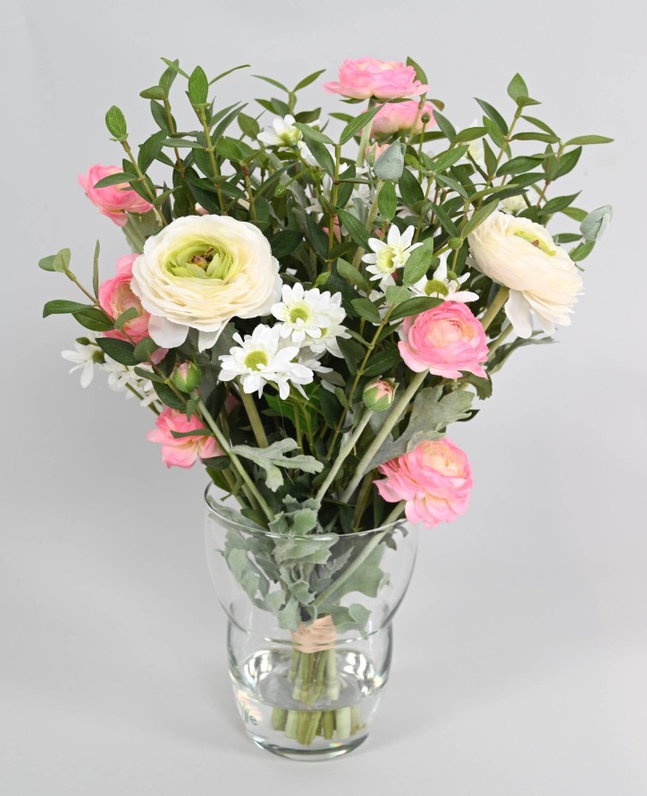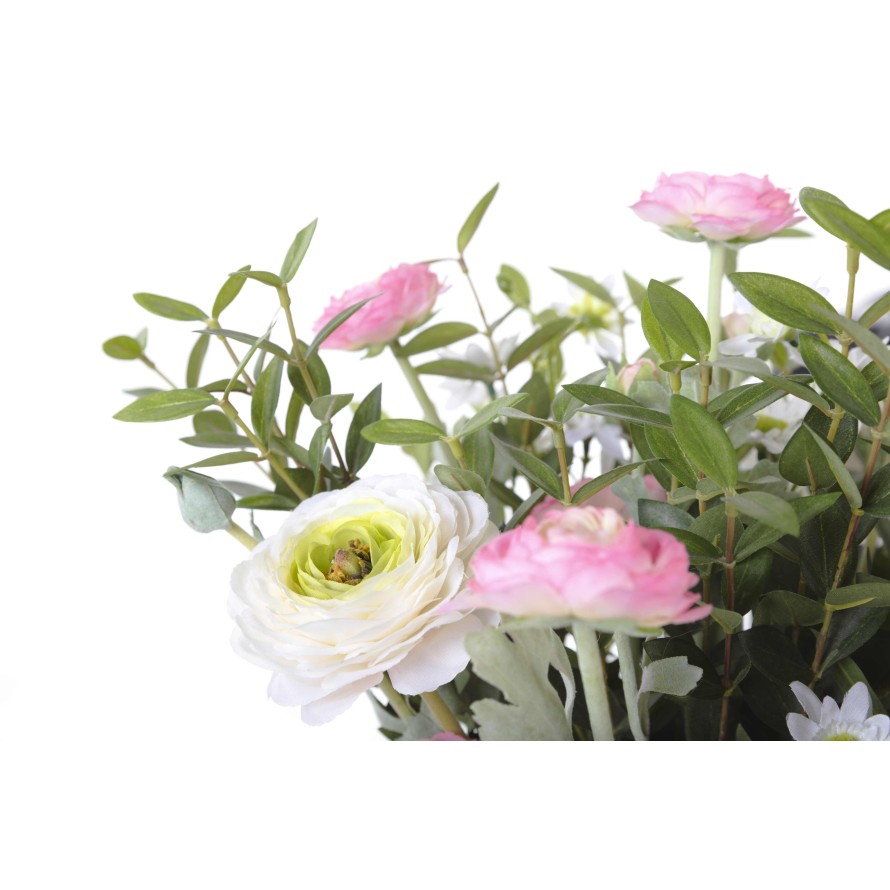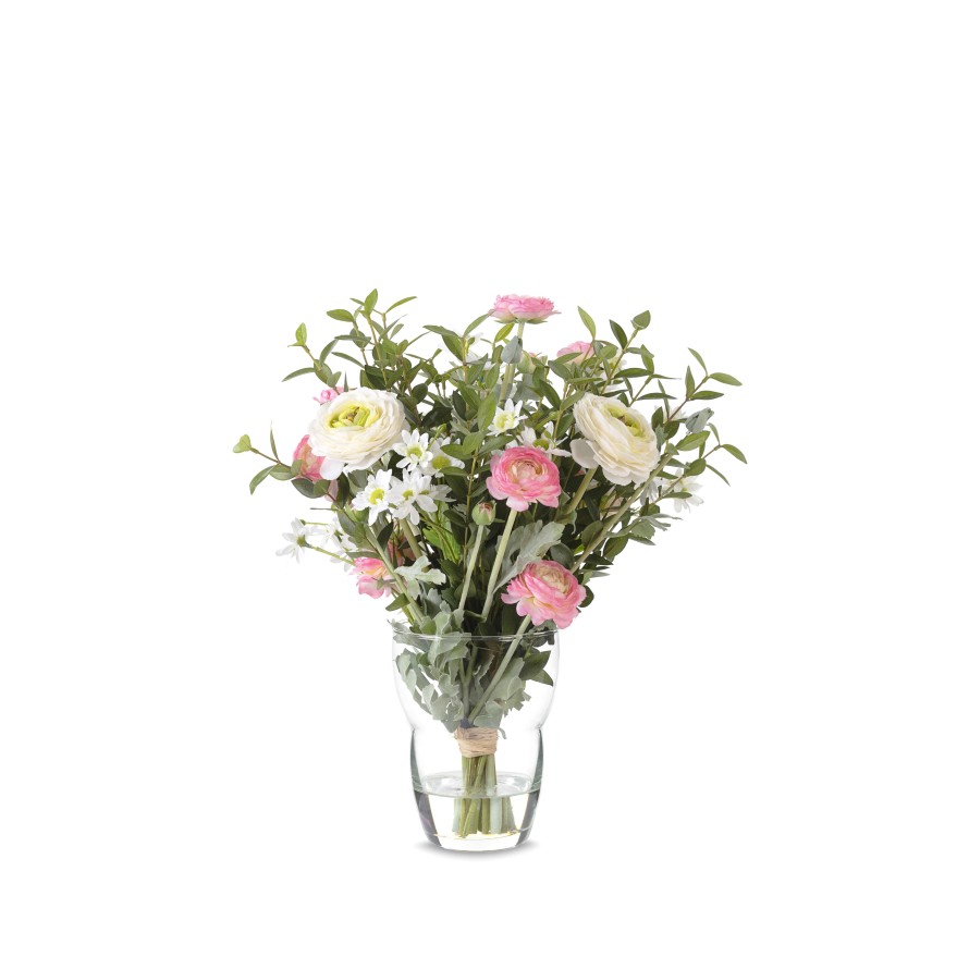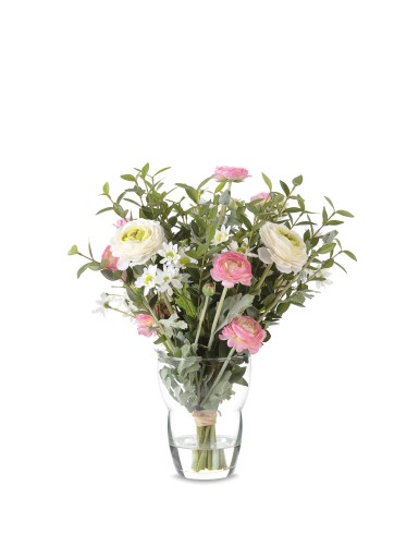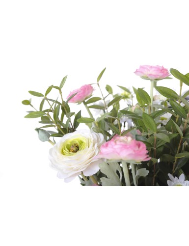 Un bouquet printanier à tout moment de l'année ! La renoncule rose et blanche, le chrysanthème et l'eucalyptus s'entrelacent dans cette magnifique composition champêtre. Elle sera parfaite pour embellir vos tables lors d'événements privés ou professionnels.