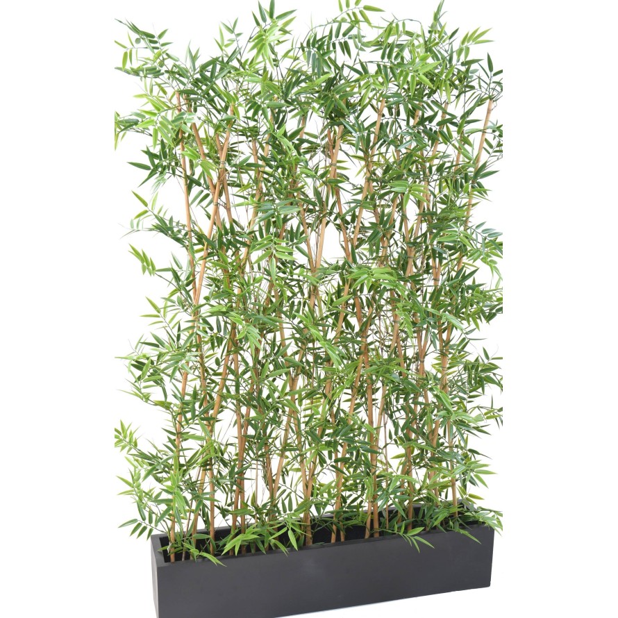 BAMBOU JAPANESE HAIE EN JARDINIÈRE Artificiel, la haie de Bambou Japanese (réf.10544-UV71) est assemblée dans une balconnière fiber noire 100x20x20 (réf. FINE1002020N). Cet ensemble peut être réalisable avec un bac différent suivant notre gamme et un surfaçage de votre choix tel que la mousse, les écorces, les billes dargile, les cailloux multicolores ou blancs. Cette composition est fabriquée dans nos ateliers en France sur commande.