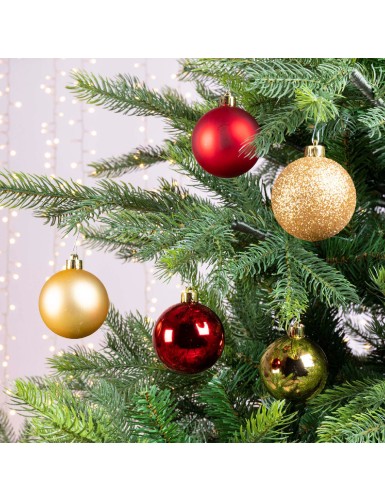 BOULE INCASSABLE MIXTE (boîte de 30) brillante, mat et pailletée : 6 brillantes or, 6 mats rouge, 6 pailletées or, 6 brillantes rouge, 6 mats or de diamètre 6 cm et un fil doré pour les suspendre.