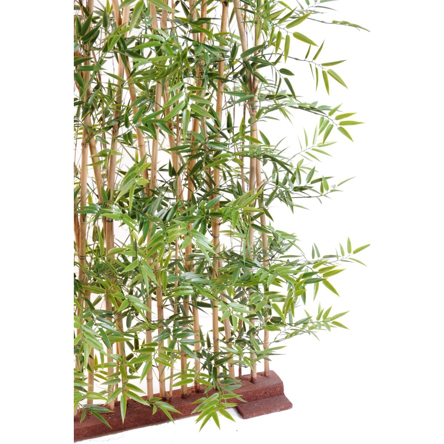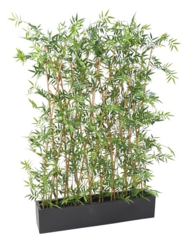 BAMBOU JAPANESE PLAST HAIE UV RESISTANT Artificiel, composé de 18 cannes de hauteur 170cm, à la base un socle en bois de 95cm de longueur par 18cm de largeur. Les feuilles sont emboîtées très fort. Convient pour l'extérieur. En extérieur, pensez à sceller dans votre jardinière le socle ainsi que le bas des cannes pour éviter que le vent ne l'arrache. Prévoir l'évacuation de l'eau du bac décoratif pour conserver le socle et les cannes à l'abri de l'humidité. Garantie résistance aux UV : 2000 heures (heures d’ensoleillement) soit environ 2 ans.