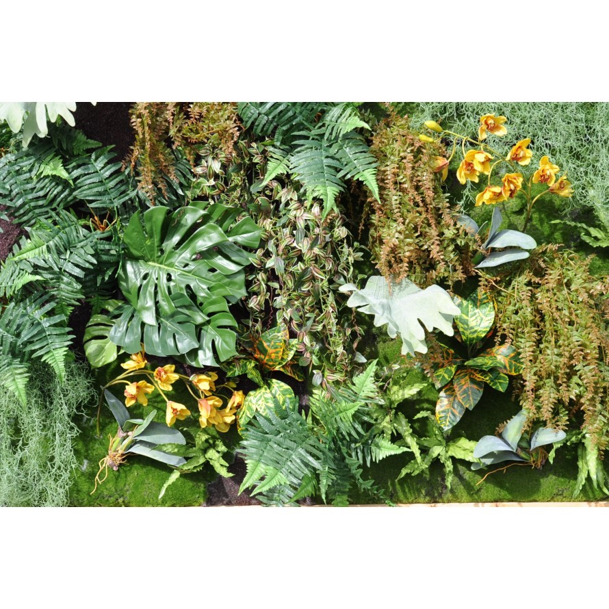 Ce mur végétal 200cm x 200cm Artificiel, a été réalisé dans nos ateliers en France, par notre fleuriste, sur commande. Il contient des petites plantes vertes artificielles (fougères, pomme de pin, herbes, mousses etc..).