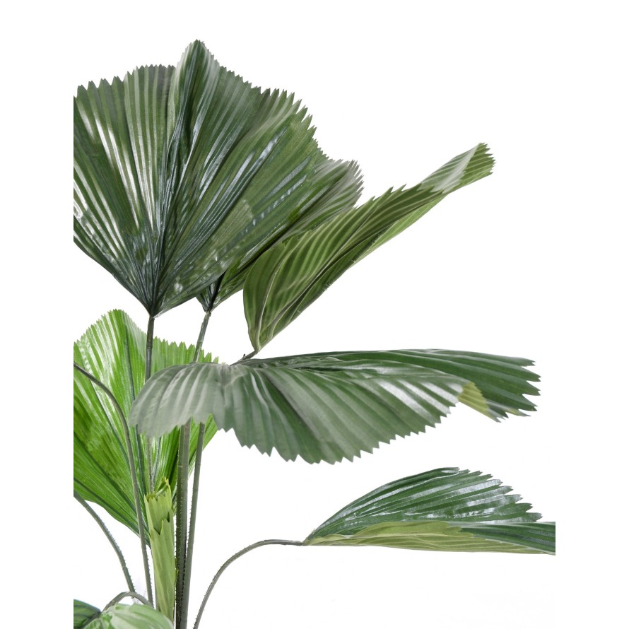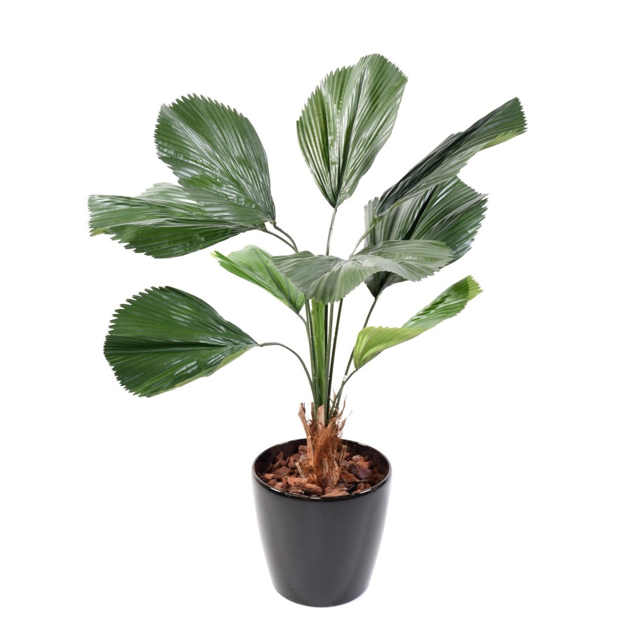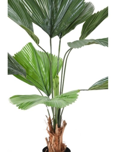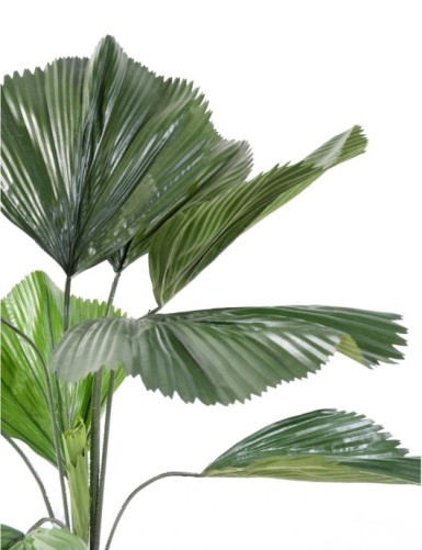 LICUALA GRANDIS Artificiel, composé de 10 feuilles de tailles différentes : 3 feuilles de 43 cm de longueur et 43 cm de largeur et 7 feuilles de 43 cm de longueur et 43 cm de largeur. Un tronc naturel recouvert d'écorces et de la coco avec une hauteur de 20 cm. A la base un pot PVC de diamètre 15 cm et de hauteur 14 cm.