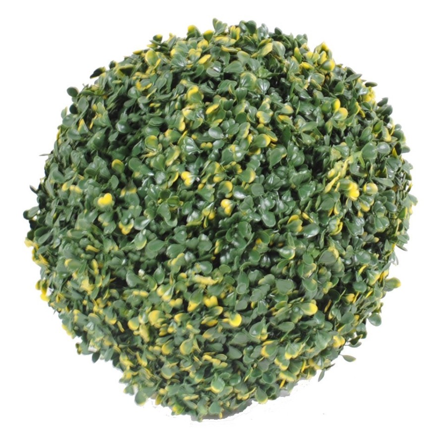 BUIS BOULE Artificiel, en deux demi-sphères, convient pour l'extérieur. Garantie résistance aux UV : 3000 heures (heures d’ensoleillement) soit environ 2ans. Il s'agit d'un produit milieu de gamme.