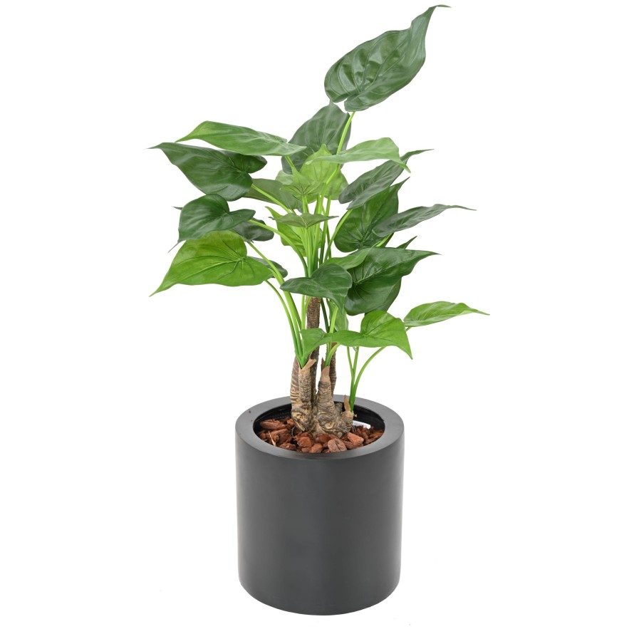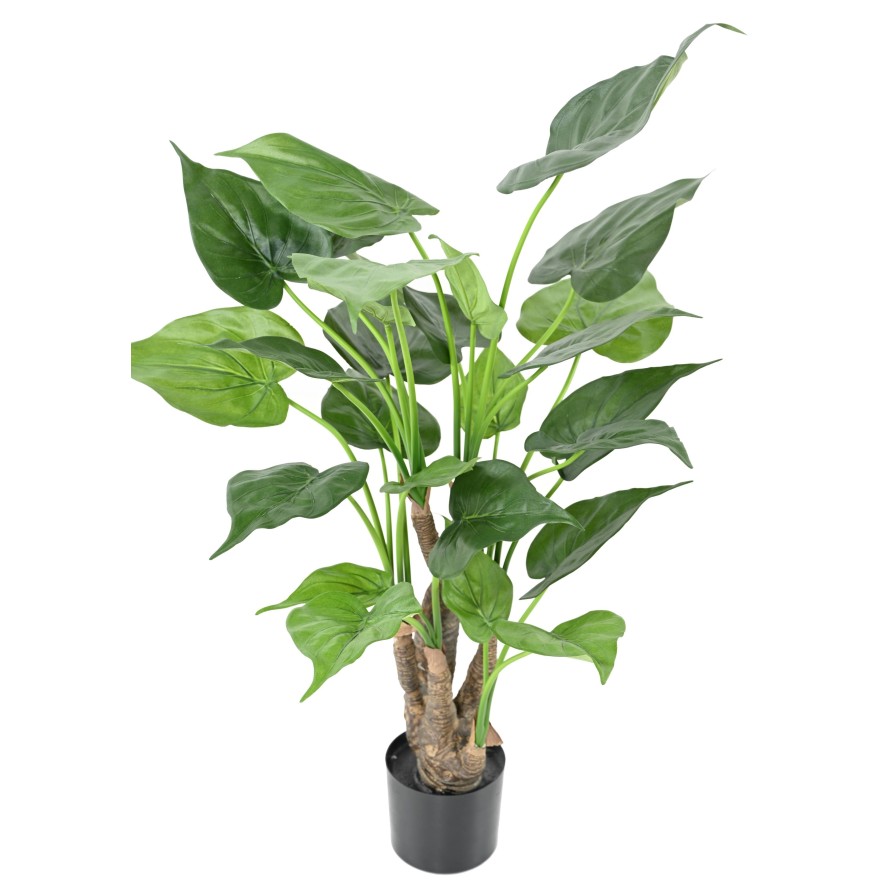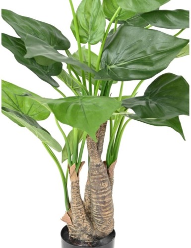 ALOCASIA CUCULLATA Artificiel, comprenant 26 feuilles de tailles différentes et 1 tronc de diamètre 10,5 cm. A la base un pot PVC de hauteur 10 cm et de diamètre 11 cm.