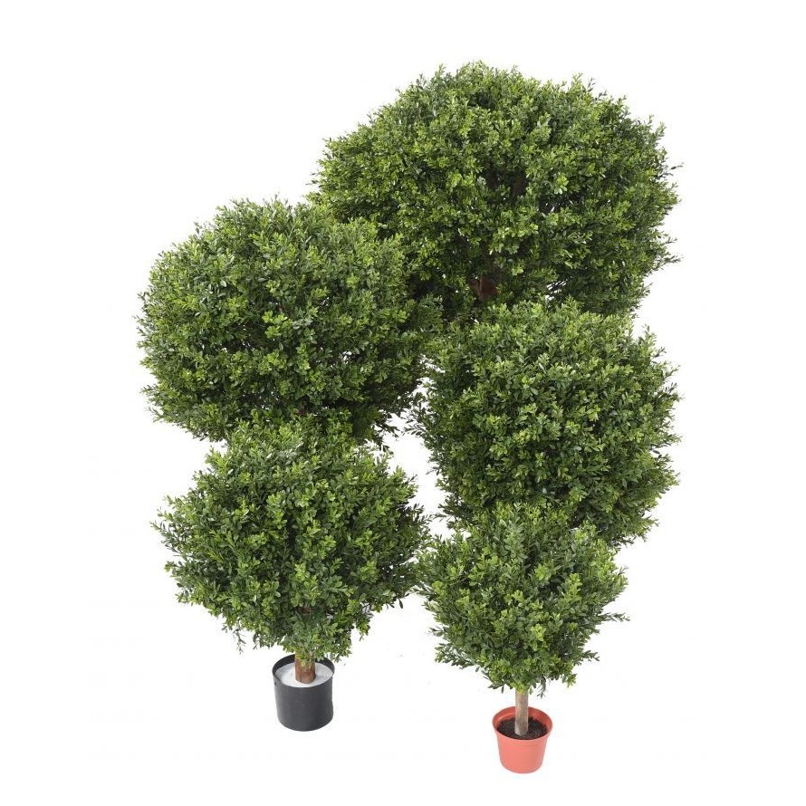 BUIS BOULE RED DAY UV Artificiel, en PE de diamètre 50cm, tronc en bois, hauteur du tronc entre le bas de la boule et avant le pot : 12cm, hauteur entre le bas de la boule jusqu'au pot (sol) : 23cm. L'essence utilisée pour le tronc est le Theaceae. A la base un pot PVC de hauteur 9cm et de diamètre 11cm. Le pot d’origine doit être percé pour permettre à l’eau de s’évacuer. Il doit être fixé au bac décoratif en créant un drainage pour éviter toute stagnation de l’eau au pied de la plante. Convient pour l'extérieur. Garantie résistance aux UV : 2000 heures (heures d’ensoleillement) soit environ 2 ans.