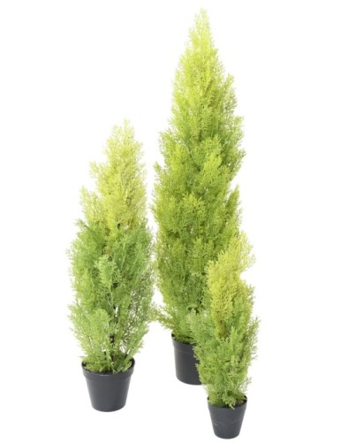CYPRES MINI NEW Artificiel, avec une envergure de 25cm, à la base un pot de diamètre 17cm et de hauteur 15cm. Le pot dorigine doit être percé pour permettre à leau de sévacuer. Il doit être fixé au bac décoratif en créant un drainage pour éviter toute stagnation de leau au pied de la plante. Convient pour l'extérieur. Garantie résistance aux UV : 2000 heures (heures densoleillement) soit environ 2 ans.