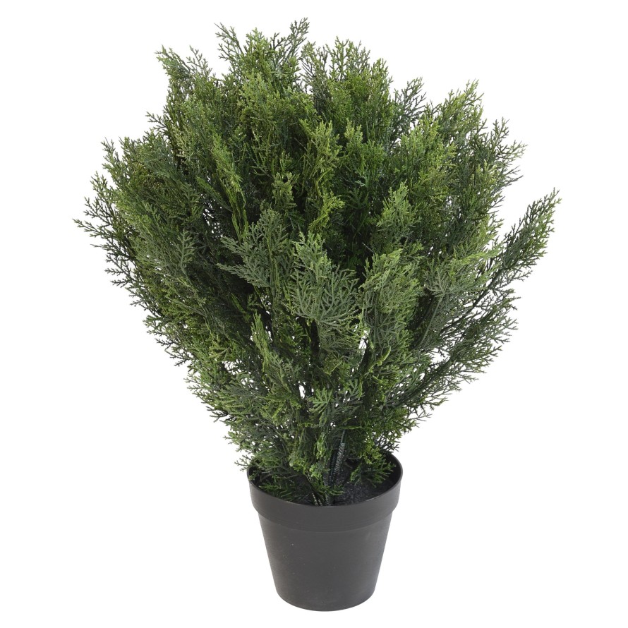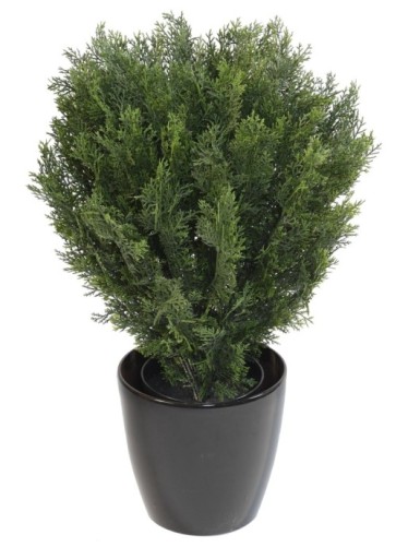 CYPRES BUISSON ROND 75 Artificiel, avec un feuillage en PE et tige armée, à la base un pot PVC de diamètre 20cm et de hauteur 17cm. Le pot dorigine doit être percé pour permettre à leau de sévacuer. Il doit être fixé au bac décoratif en créant un drainage pour éviter toute stagnation de leau au pied de la plante. Convient pour l'extérieur. Garantie résistance aux UV : 2000 heures (heures densoleillement) soit environ 2 ans.