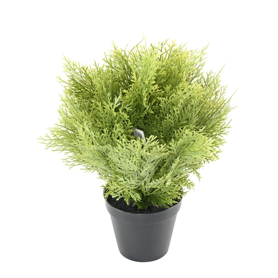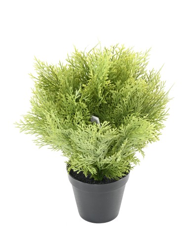 CYPRES ROND 35 Artificiel, avec une envergure de 35 cm, à la base un pot PVC de diamètre 16 cm et de hauteur 14 cm. Le pot dorigine doit être percé pour permettre à leau de sévacuer. Il doit être fixé au bac décoratif en créant un drainage pour éviter toute stagnation de leau au pied de la plante. Convient pour l'extérieur. Garantie résistance aux UV : 2000 heures (heures densoleillement) soit environ 2 ans.
